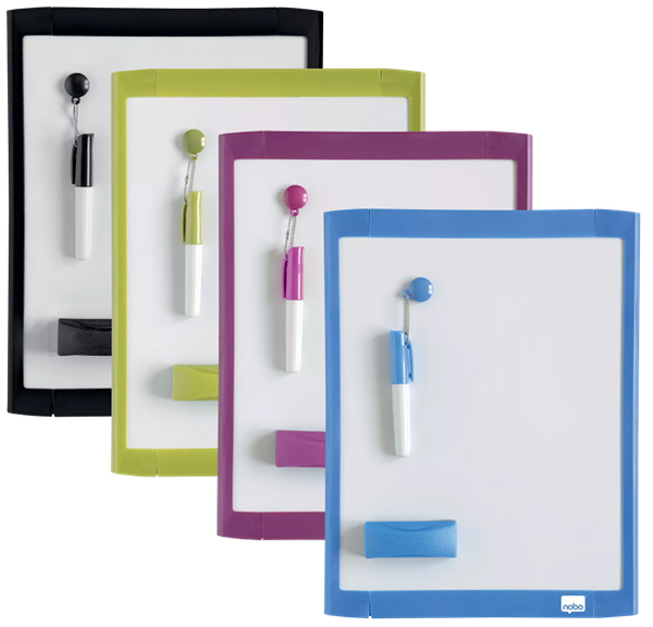 Mini magnetic whiteboard with assorted frame colour, with matching whiteboard pen and whiteboard eraser. Size 216 x 280 mm.