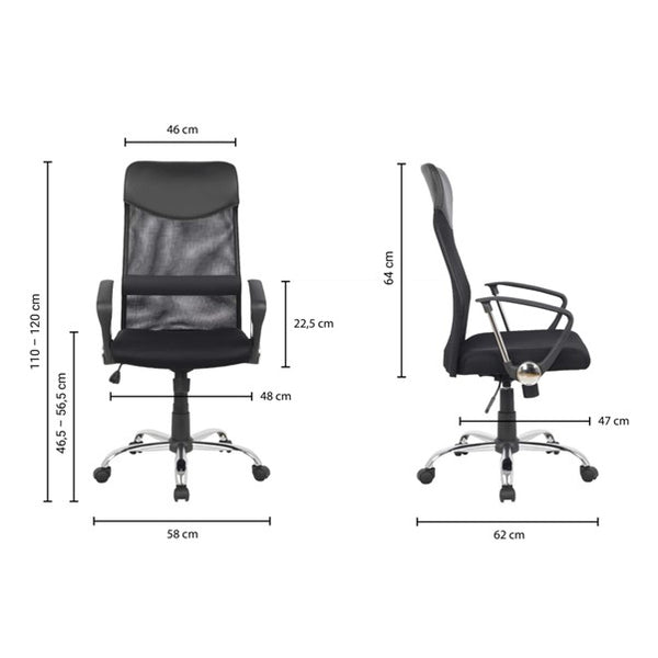 Backrest: 46 cm. Seat width: 48 cm. Height backrest: 64 cm. Seat depth: 47 cm. Adjustable seat height 46.5 cm up to 56.5. Height Armrests 22,5cm.