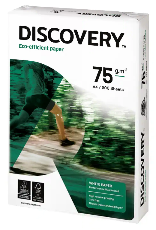Discovery A4 75 g/m2 printer paper guarantees outstanding performance, with reduced paper jams and high-quality eco-efficient performance.