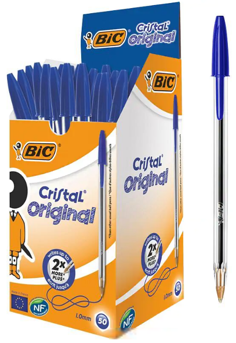 The classic BIC Cristal Original pen with its clear hexagonal barrel and high-quality ink is the world’s best-selling ballpoint pen as it now lasts twice as long as most commonly known ballpoint pens, this box contains 50 blue ballpoint pens which will keep you going for a while!