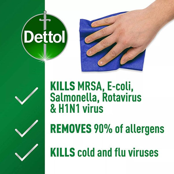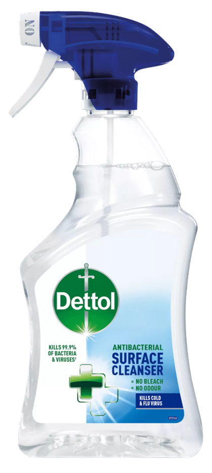 Say hello to cleanliness with Dettol cleaning supplies Get a powerful clean with this Dettol surface cleaner. Description Dettol Antibacterial Surface Cleanser is a surface spray that kills 99.9% of bacteria & viruses including E. coli, salmonella, MRSA and the flu virus. This effective antibacterial spray is a non bleach, no taint and no odour solution that can be used on food preparation areas, highchairs...View more