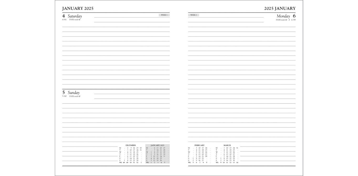 Additionally, there are Notes pages and monthly accounts pages. The diary pages contain national holidays, Week numbers, PAYE week numbers and summary monthly calendars. Printed on White FSC paper.