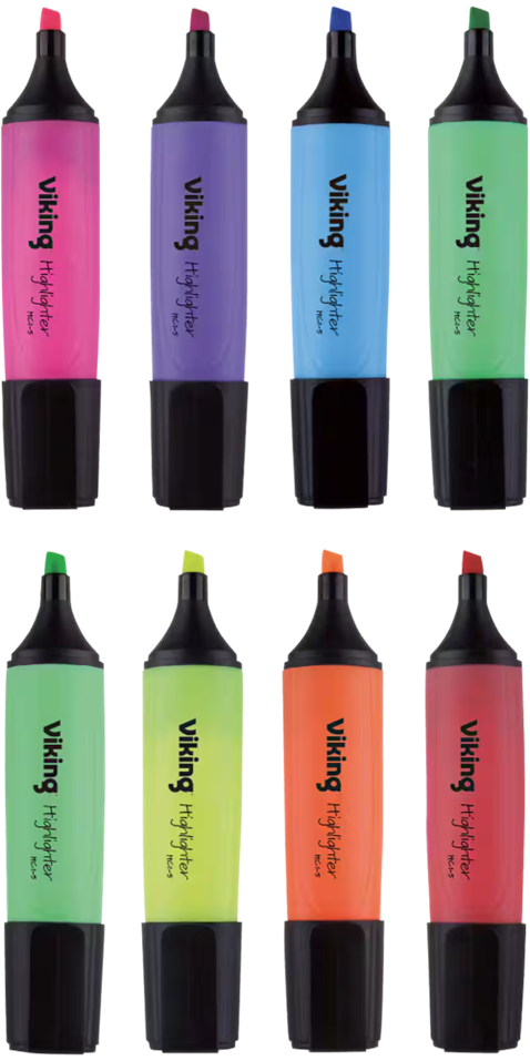 This pack contains 8 Viking HC1-5 highlighters in blue, green, teal, purple, pink, orange, yellow and red that let you colour code your documents according to the degree of importance. Each pen has a replaceable cap that prevents the ink inside from drying. This is an economical choice for your office stationery supply.